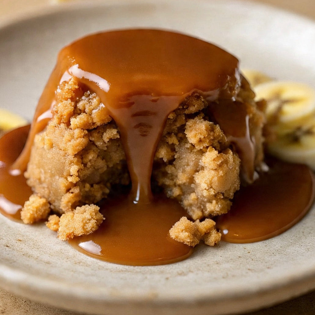 Delicious banana sponge with lashings of decadent caramel sauce.