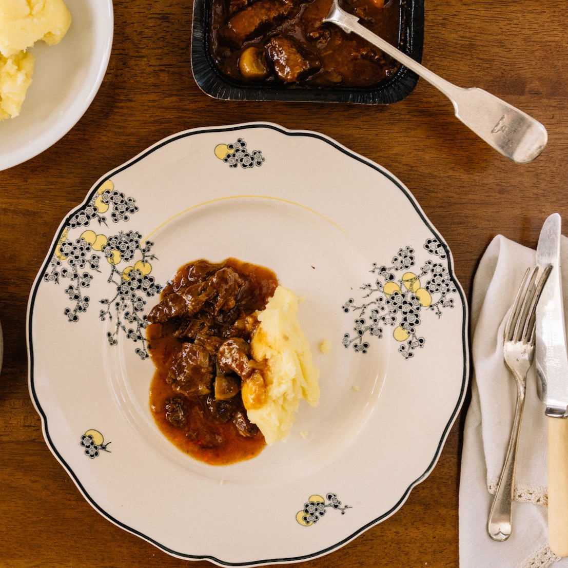 Tender pieces of beef slow cooked with mushrooms, smoked paprika and a touch of cream, served with mashed potato and green beans.